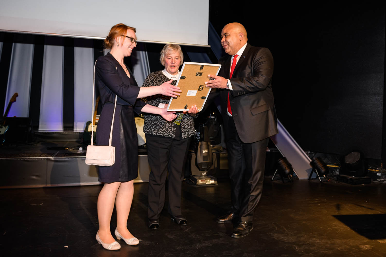 Dr. Chima Abuba (Leitung HARTMANN Deutschland) überreicht die Urkunde an Anna Meiners (Mitte, Mitglied des Vorstands Howe-Fiedler-Stiftung) und Tanja Bollmann (Links, Kieler-Senioren-Lotsin / Howe-Fiedler-Stiftung)