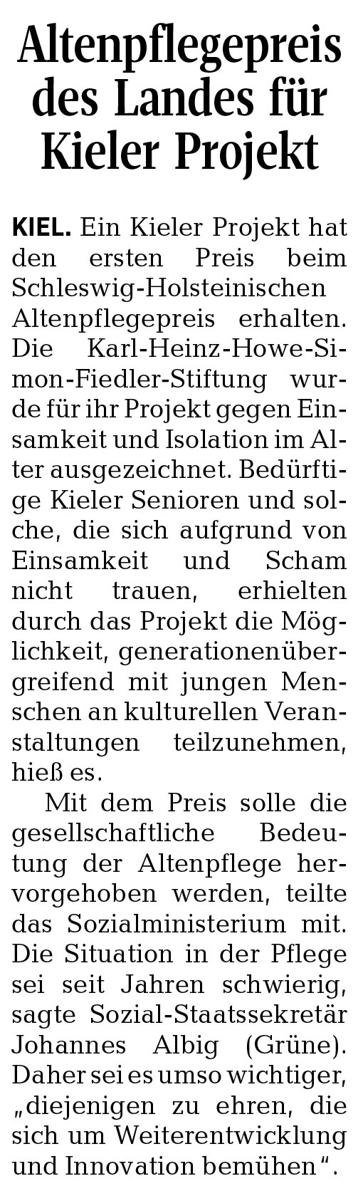 Die "Kieler Nachrichten" berichten in ihrer Ausgabe vom 12.12.2022 über den 1. Platz des "Schleswig-Holsteinischen Pflegepreises", den wir mit unserem Projekt KulturistenHOCH2Kiel erreichen konnten. Das freut uns natürlich sehr und macht uns nicht nur stolz, sondern spornt uns auch an. Hier können Sie den Artikel lesen: